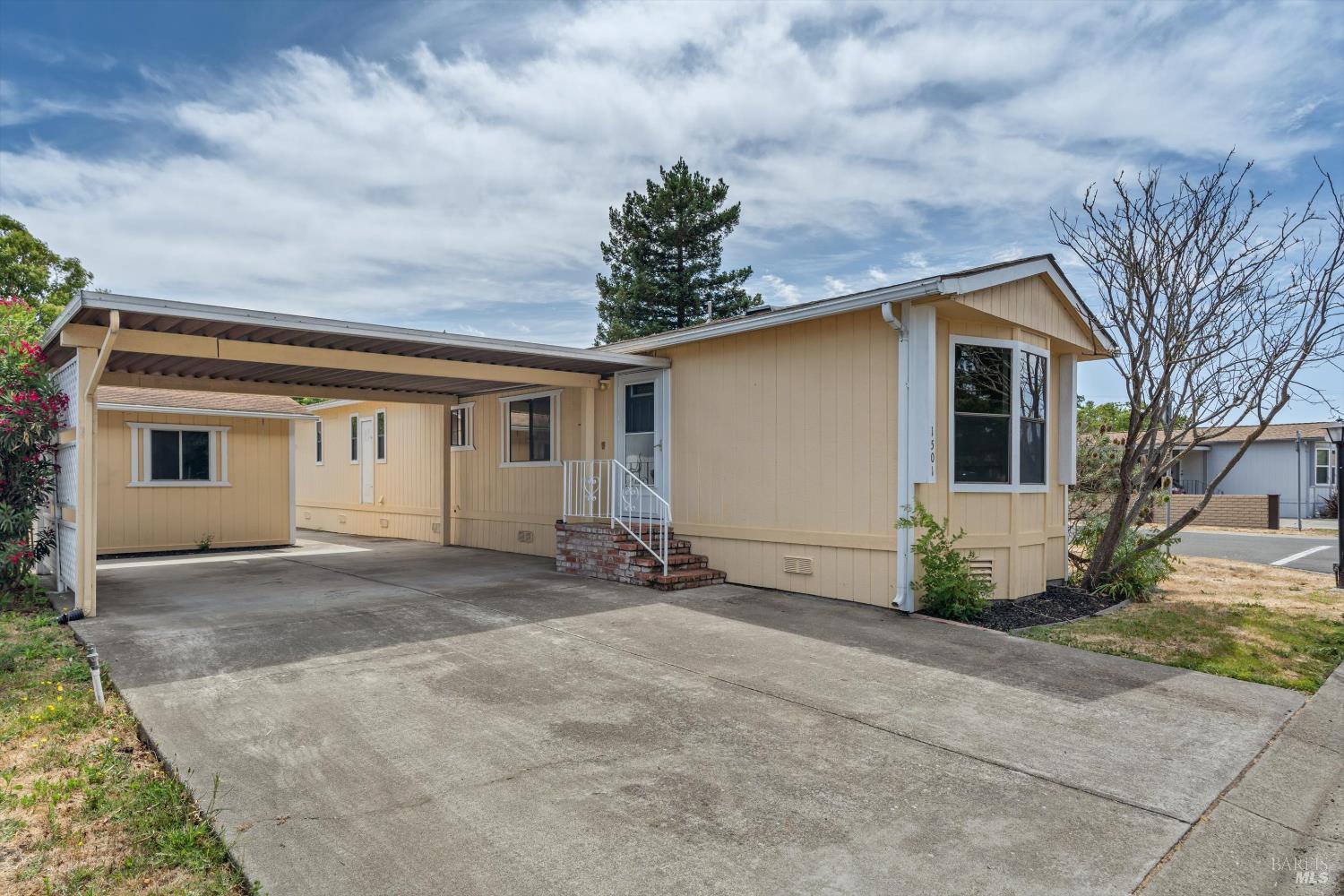 Welcome to 1501 Florence Way, a delightful 2-bedroom, 2-bath home on a generous corner lot in the sought-after Royal Oaks Mobile Home Park, a 55+ community in Petaluma. Light and warmth fill the updated kitchen, complete with butcher block countertops, a skylight, and newer appliances. The open living and dining area features vaulted ceilings, central heat and air, and plenty of space to gather or unwind. Step outside to the inviting front porch or take advantage of the extra outdoor space the corner lot providesideal for gardening, entertaining, or a quiet seating area. Royal Oaks residents enjoy a friendly neighborhood atmosphere and wonderful amenities, including a pool, spa, and clubhouse with social activities. With its convenient location near shopping, dining, medical services, and public transportation, this lovingly maintained home offers the perfect opportunity to enjoy low-maintenance living in an active and welcoming senior community.